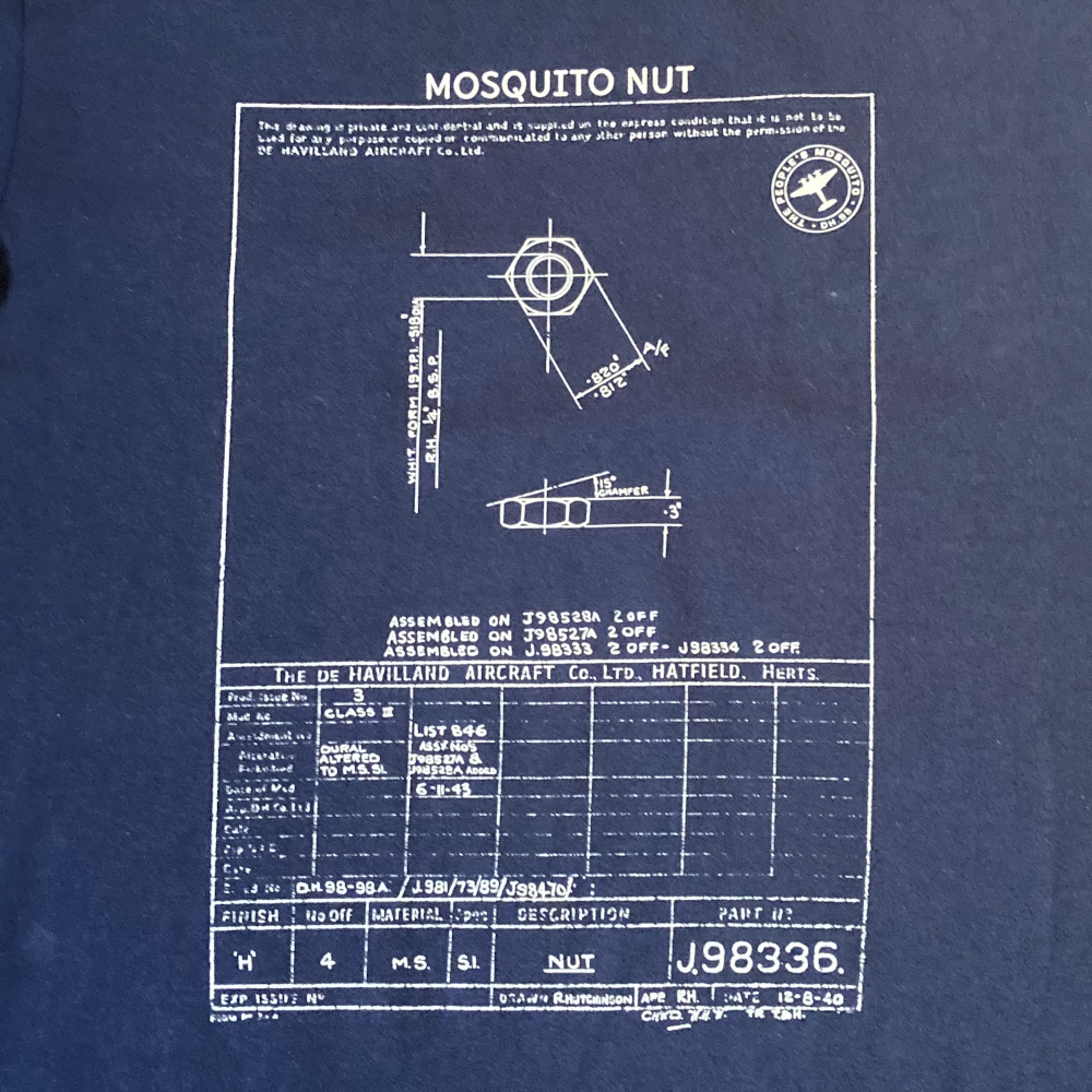 Joking apart, here comes the Science bit – this is an actual de Havilland drawing from 1940 that we came across whilst digitising our drawing collection. We’ve reproduced it for you on a Navy blue T-shirt in all its vintage glory so that unsuspecting members of the public can be forewarned that a ‘Mosquito Nut’ is approaching!